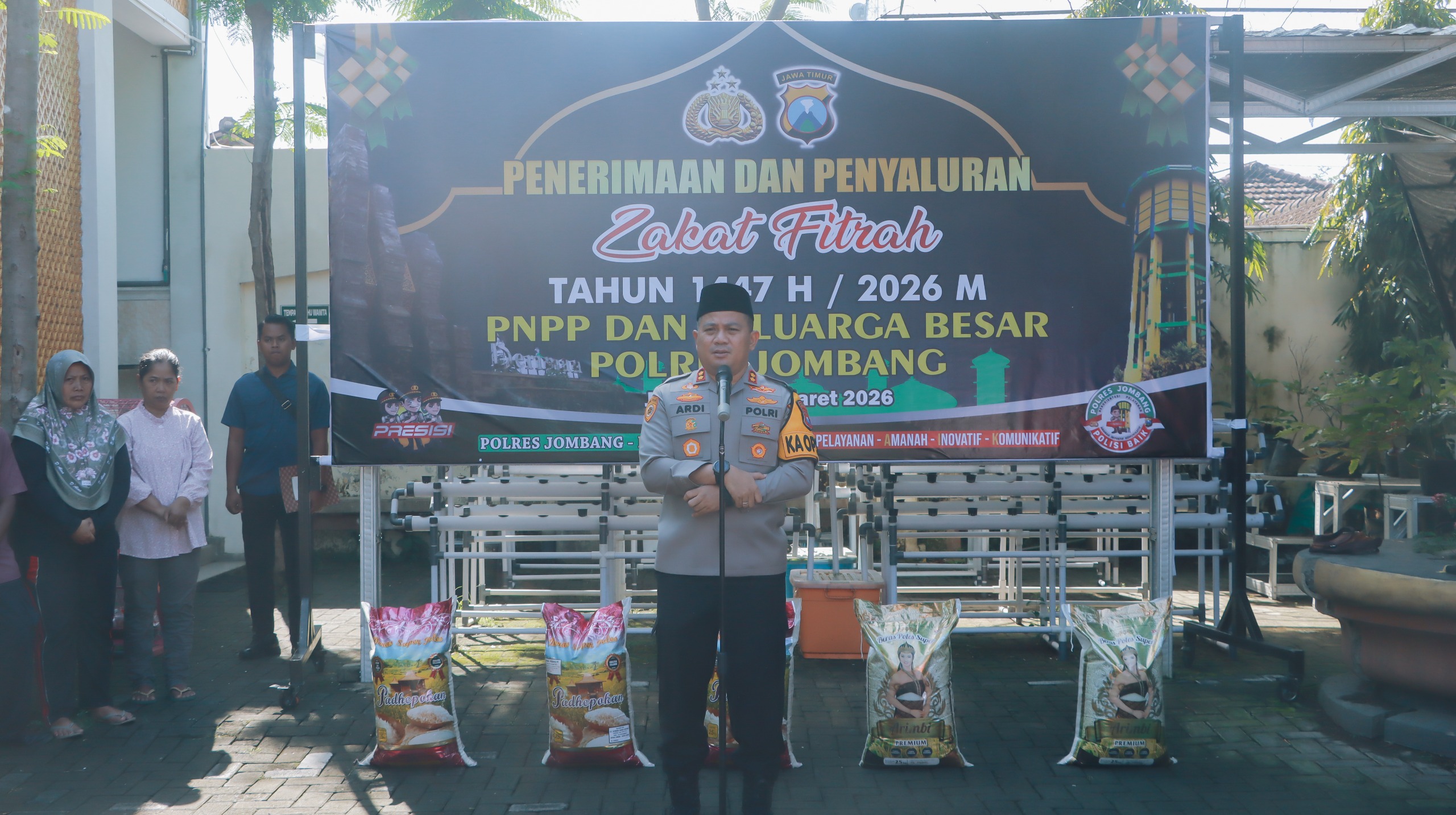Kapolres Jombang, AKBP Ardi Kurniawan, S.H., S.I.K., CPHR menyampaikan bahwa zakat fitrah merupakan kewajiban bagi setiap umat Islam yang dilaksanakan menjelang Hari Raya Idulfitri sebagai bentuk penyucian diri sekaligus sarana membantu sesama.
